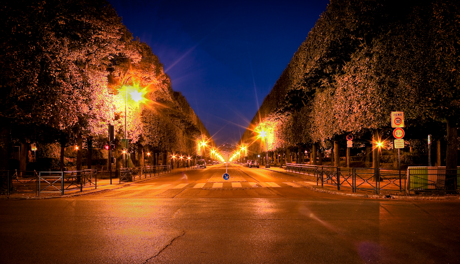 Street from just outside the Parc de Sceaux. I liked the cut of the trees “T” shaped. With the lights and the low traffic (Sunday night) it was a nice shot to try out the vanishing point.