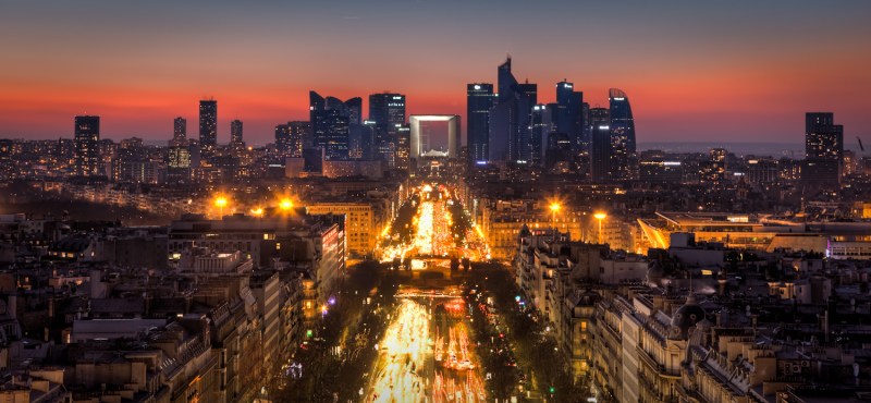 La Defense at sunset, in HDR. Taken from atop Arc de Triomphe in the chilly March weather of Paris.
