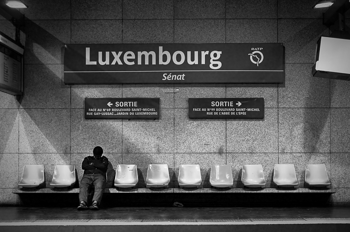 Sleeping in the Metro, a Paris street photo I took some time ago. This gentleman was waiting for his metro, which took a while to come. Not even so sure he didnt miss a couple before he realized what was happening.