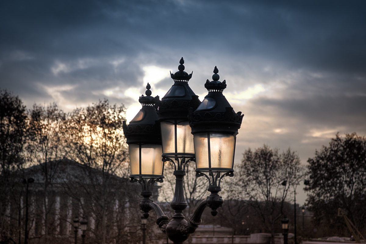 After a day of walking around and being a tour guide for family we arrived at Place de la Concorde and the sky was slowly clearing up as the sun was setting. Got this shot of the lights with the sun behind the lights shining through the matte glass but not enough to burn out the image.