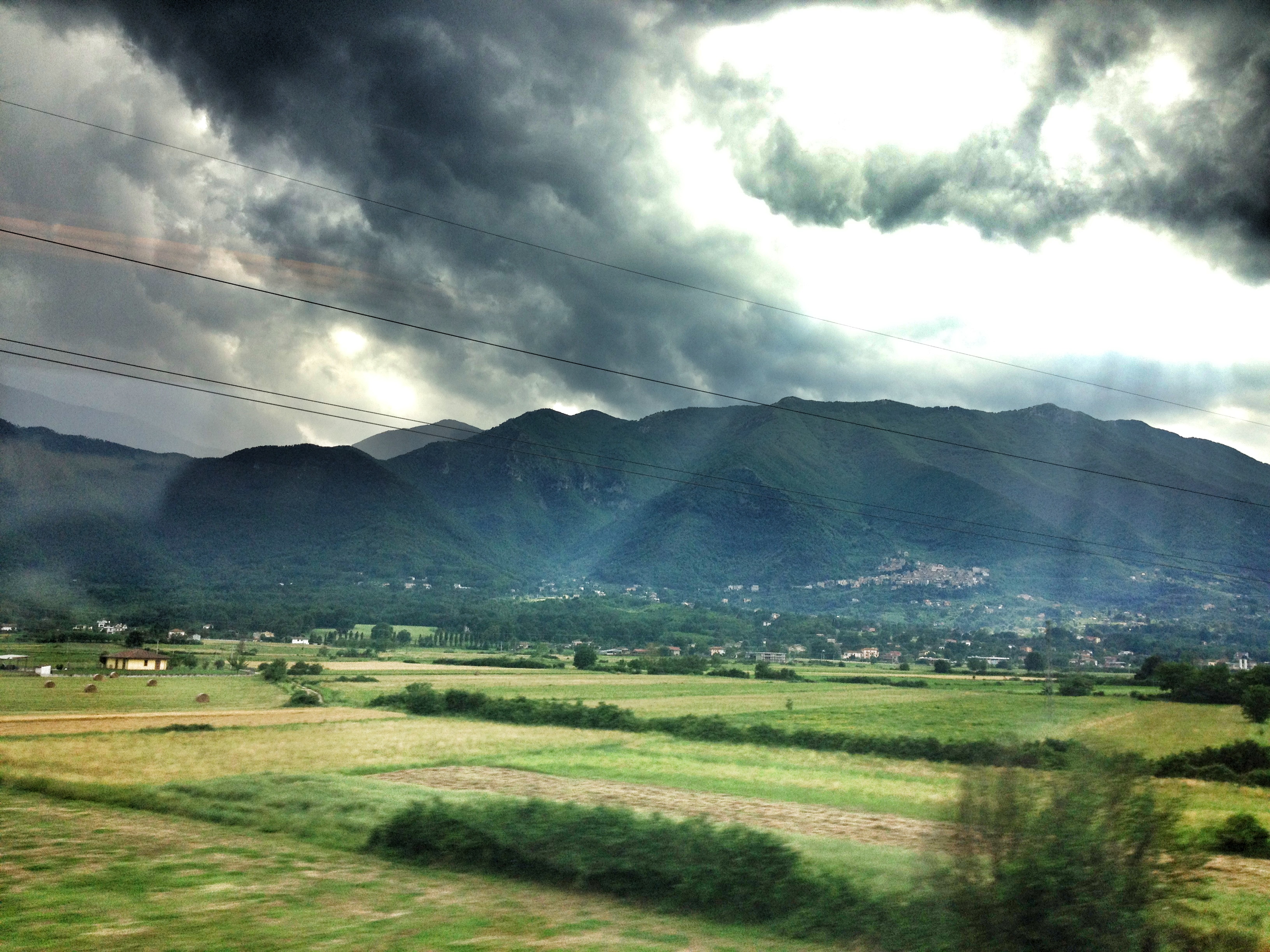 As I came back from the incredible island of Capri, after having visited a great hotel called Tiberio Palace on the island I sat on a high-speed train going from Naples to Rome. The sky was going from rain, to sunshine and changing all the time. At one point the sun rays were cutting through the clouds like flood-lights on a stage. I managed to capture the picture and enhance it with Snapseed to recover some of the sun-rays. But it’s not nearly as impressive as real life.